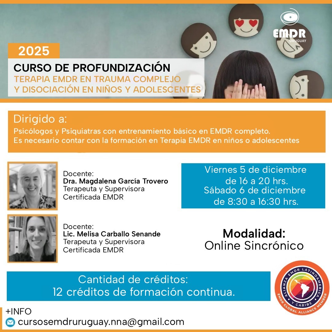 Viernes 5 de diciembre d e 16 a 20 h y el sábado 6 de diciembre de 8:30 a 16:30 h se desarrollará el curso de profundización Terapia EMDR en niños y adolescentes – Trauma complejo y disociación.