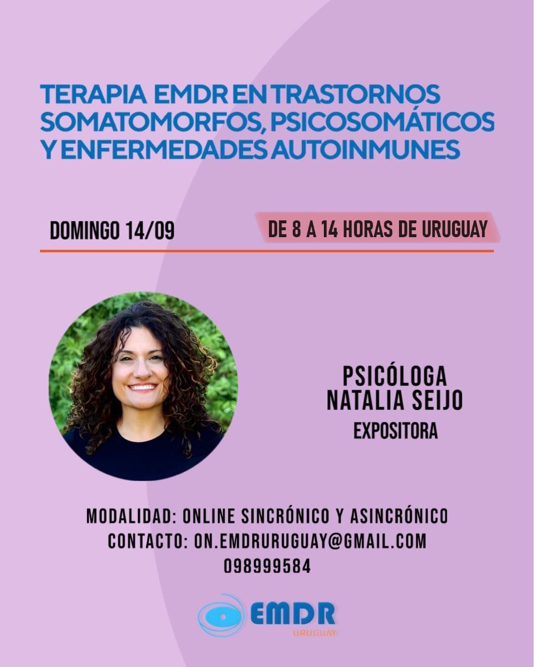 El próximo domingo 14 de setiembre de 8 a 14 horas de Uruguay (GTM -3) se desarrollará la exposición de la psicóloga Natalia Seijo Terapia EMDR en trastornos somatomorfos, psicosomáticos y enfermedades autoinmunes.